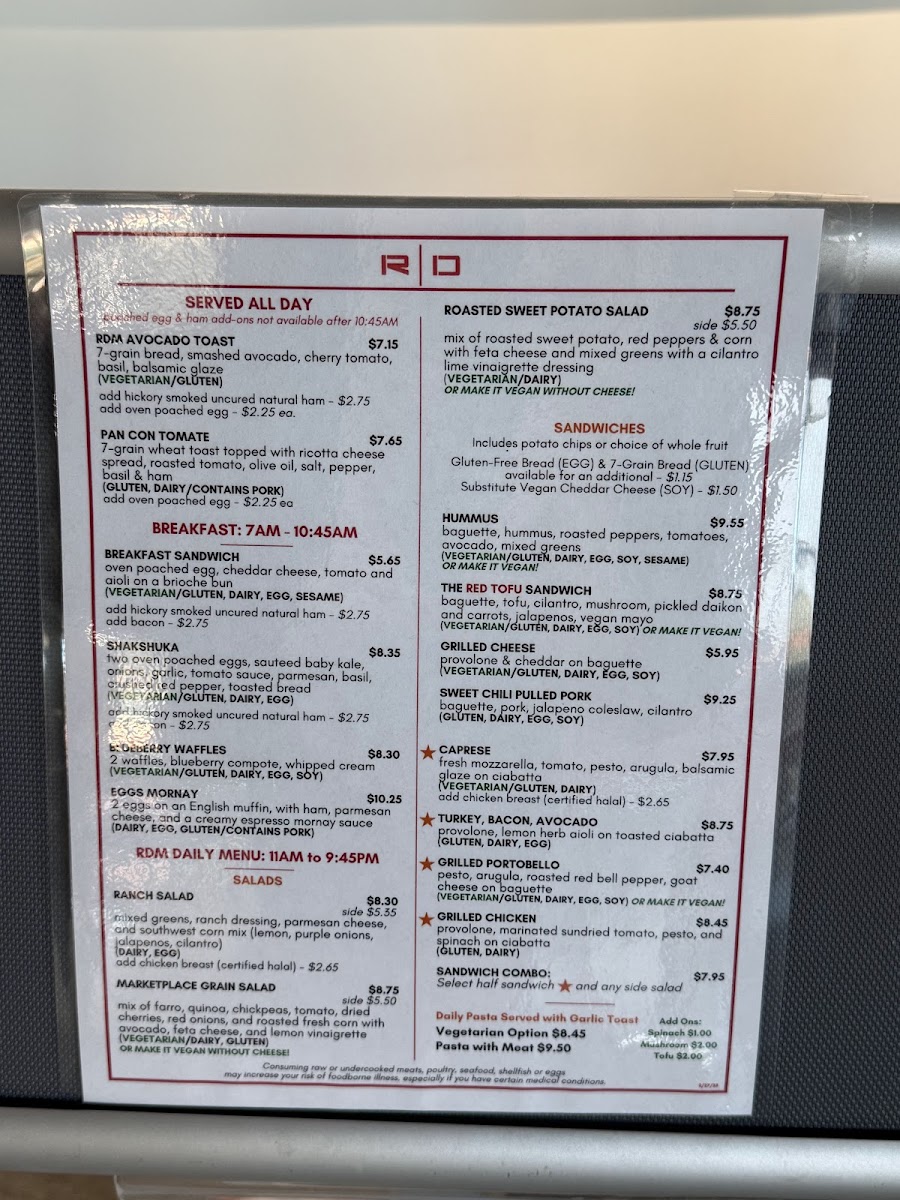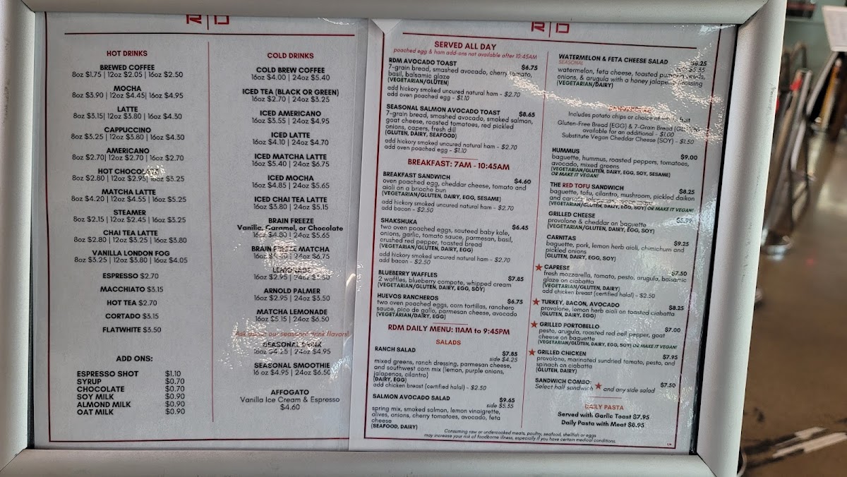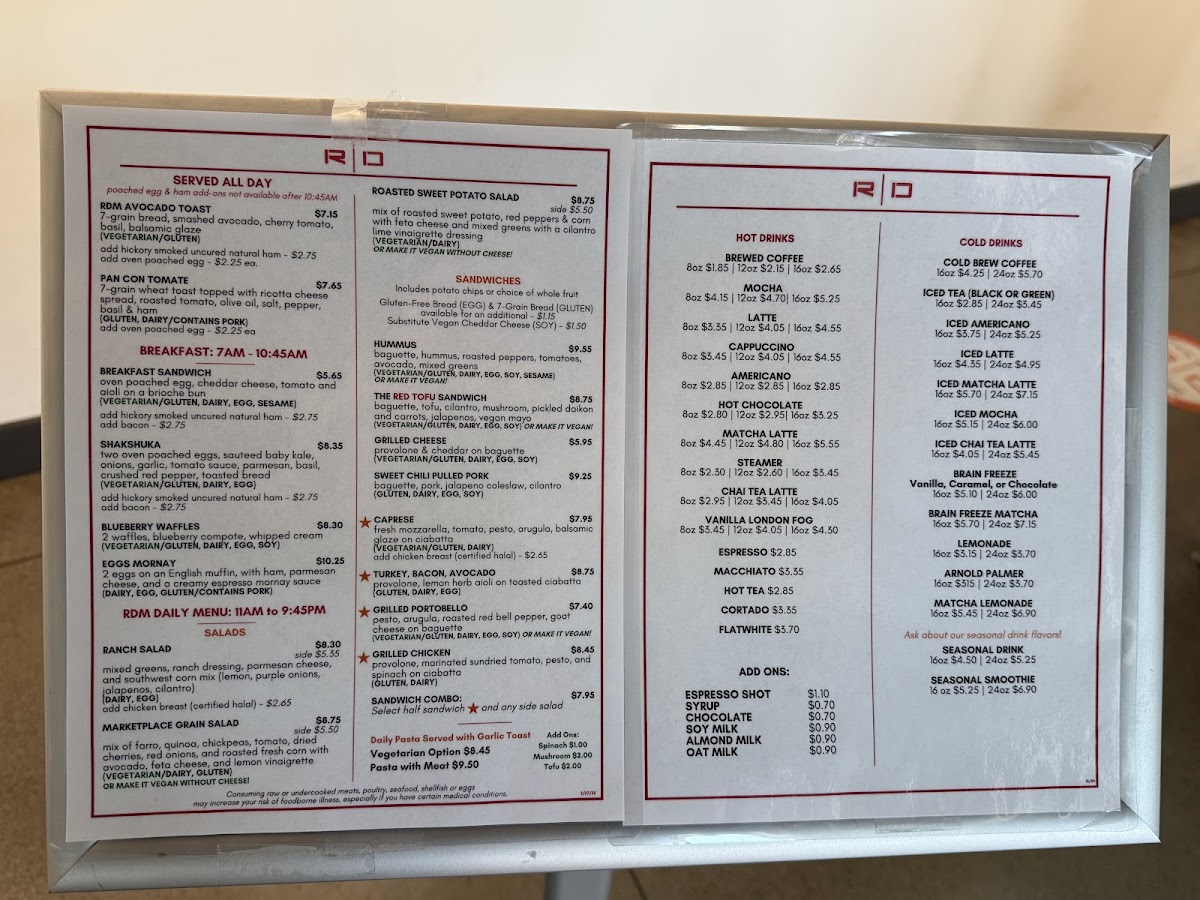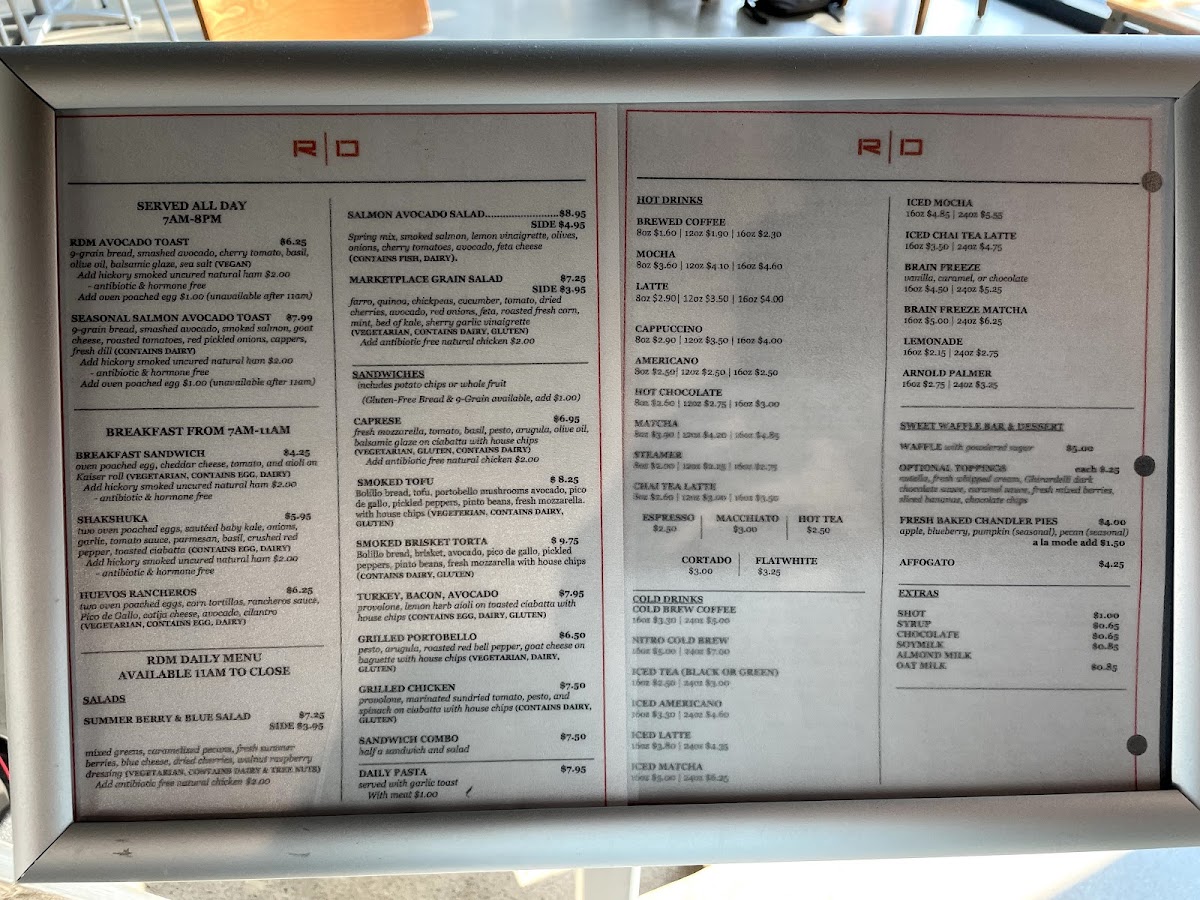The menu features enticing selections such as the refreshing Pan Con Tomate for $2.25 and the beloved Rdm Avocado Toast for $7.15, both ideal for a quick bite. If you're in the mood for something heartier, try the Sweet Chili Pulled Pork or indulge in a Grilled Cheese.
